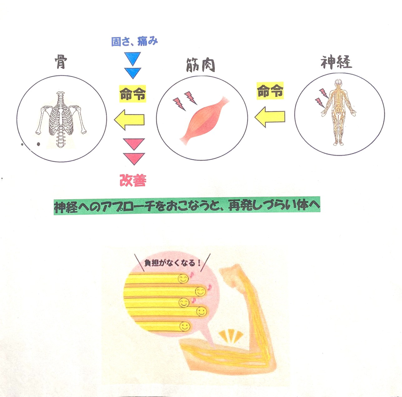 これまでのマッサージやストレッチなどの一般的な施術では、一時的によくなってもすぐに症状が戻ることがあります。